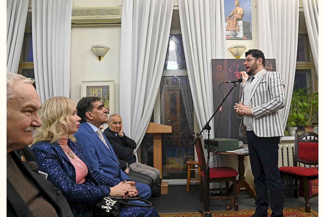 Андрей Анатольевич Горчаков, являющийся давним другом и дарителем Музею имени Н. К. Рериха, начал свое выступление с поздравительных слов, объявления присутствующих гостей, после чего на экране был представлен телевизионный репортаж 33 канала (г. Киев) о культурной и дипломатической деятельности господина Горчакова, об избрании его почетным профессором Национальной академии руководящих кадров культуры и искусств и почетным членом Одесского Дипломатического клуба.